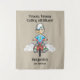 Um garotinho num triciclo vermelho chama todos os seus amigos para a sua festa de aniversário.