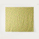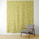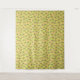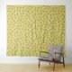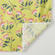 Patterned design with pink flowers and dark green leaves scattered on a bright yellow background. The floral motif is cheerful and lively.