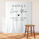 Boas-vindas e tapeçarias de fotos brancas, mostrando "Feliz Sempre Depois" em uma simples tipografia e um moderno roteiro de na moda, um coração, seus nomes e data de casamento.
