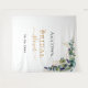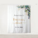 Um fundo branco chic. Decorado com folhas de eucalipto pintadas à mão em verde, raminhos, folhagem e folhas douradas. Personalize e adicione o nome da noiva e uma data. Letras pretas e douradas. Pode ser usado como banner de boas-vindas para Chá de Noiva, como decoração de parede para festa ou como fundo para cabine de fotos.