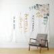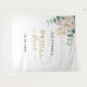 Um fundo branco chic. Decorado com uma flor branca (peônia) e folhas de eucalipto coloridas à aguarela, ramalhetes, folhagens e um ramo falso dourado. Personalize e adicione o nome da noiva e uma data. Letras pretas e douradas. Pode ser usado tanto como um banner de boas-vindas quanto como decoração de parede para a festa.