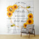 Tapeçaria elegante e divertida para chá de noiva de verão. Uma parede de celeiro de madeira rústica branca como fundo. Com uma moldura geométrica em dourado falso. Decorado com girassóis rústicos amarelos e laranjas em aquarela e abelhas felizes. Com o texto: Noiva a caminho e o nome da noiva. Personalize e adicione o nome da noiva e uma data. Pode ser usado como decoração de parede para o chá de noiva ou como pano de fundo para fotos.