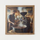 Um close-up das mãos em um avental vestido cuidadosamente adicionando uma colher de grãos de café marrom ricos em uma máquina de torrefação de café vintage. O vapor ou a fumaça sobem graciosamente da máquina, apontando para o processo de assagem aromático no interior. O cenário industrial, porém convidativo, apresenta uma parede de tijolos rústica e iluminação quente, lembrando um confortável compro de café ou assalto. Prateleiras cheias de itens relacionados ao café acrescentam ao autêntico ambiente de café.