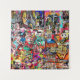 Esta colorida arte em parede apresenta uma colagem de trabalho de arte estilo rua.