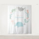 Este tapete de chá de bebê temático sob o mar apresenta uma baleia, tubarão tigre, medusa, tartaruga marinha e cavalo-marinho todos nadando em um círculo com algas marinhas e conchas.