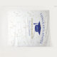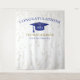 Pano de fundo de celebração de formatura moderno para oportunidades de fotos! Brilho no topo e na parte inferior, serpentinas douradas a partir da borda superior, chapéu de formatura e letras em azul, modelo de nome em dourado. Turma de em letras de script glitter dourado com modelo de ano em branco. Adicione ano, nome e nome da escola.