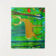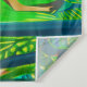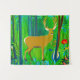 Tapeçaria na ilustração estilizada de um veado num cenário de conto de fadas, cercado por árvores e plantas, em tons de marrom e verde