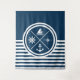Design náutica com símbolos náuticos (âncora, barco à vela, roda à vela, bússola) decoração em fundo listrado branco e azul marinho.