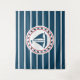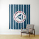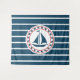 Design náutica com decoração de embarcações à vela em forma redonda, em fundo listrado a azul e a branco
