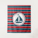 Design náutica com decoração de embarcações à vela em forma redonda com estrelas sobre fundo listrado vermelho, azul e branco