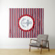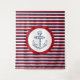 Design náutico com decoração da âncora desenhada à mão sobre fundo riscado a azul, vermelho e branco