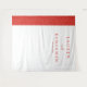 This wedding backdrop features a minimalist design with a striking vertical split. The left side showcases a textured red panel with intricate leaf or feather patterns, while the right side offers a clean white background for contrast. Elegant typography in serif and script fonts highlights the names, creating a sophisticated yet simple look. The warm color palette of reds and whites evokes feelings of love and celebration, making it perfect for a romantic wedding setting.