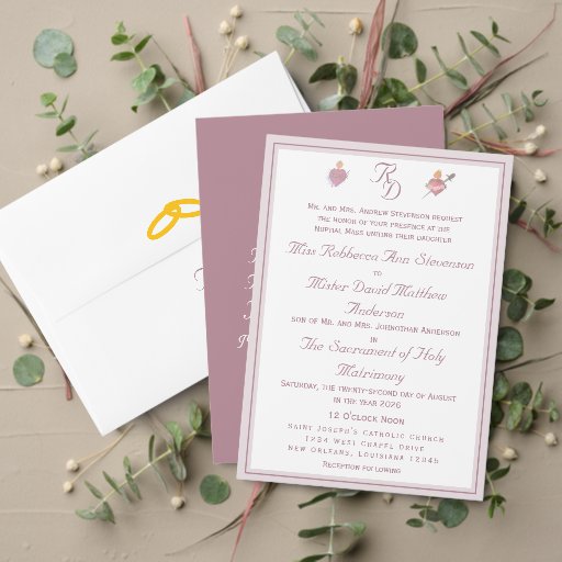 Design features a dusty-rose colored background to the initials of bride and groom displayed in an elegant pale-pink Nuptial font and joined together. Customizable message is displayed above as an arch. Top left corner features the image of the Sacred and Immaculate Hearts of Jesus and Mary together. Bottom left displays the image of joined wedding rings. Designed to coordinate with the "Two Hearts Catholic Wedding Suite (Dusty Rose)" collection. Available in a variety of colors.