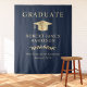 Elegante tapeçaria de boas-vindas à festa de formatura azul-escura e cenário de fotos com boné de formando de ouro, "Formando" e o nome do formando, escola e ano de aula em tipografia de serifa clássica.