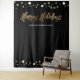 Monte uma cabine de selfie para fotos que duplica como um sinal de boas-vindas no seu próximo evento de Natal corporativo. Impressão dourada com letras "Feliz Natal" para combinar com os convites desta coleção. Confetes dourados e brancos em um fundo preto elegante.