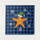 Uma ilustração de um bonito desenho animado, o peixe-estrela laranja kawaii, vestindo um chapéu de santa verde rodeado de flocos de neve para o Natal em um padrão de búfalo preto e azul. Essa vida marinha em um design de controle é uma ideia de presente para amantes do Natal, amantes do Papai Noel e amantes do oceano.