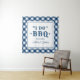 Allegre e elegante tapeçaria personalizada de casamento / fundo de festa para um evento de "Eu Faço Churrasco" no quintal. Personalize com os nomes dos noivos e data. Inclui uma borda xadrez azul marinho e branco / padrão de xadrez de toalha de mesa e tipografia rústica elegante. Perfeito para um casamento casual de churrasco ao ar livre no verão ou recepção.