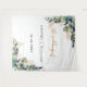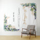 Um fundo branco chique. Decorado com folhas de eucalipto coloridas em verde à aguarela, ramalhetes, folhagens e folhas douradas falsas. Personalize e adicione o nome da noiva e do noivo e uma data. Letras pretas e douradas. Pode ser usado como um banner de boas-vindas de casamento, como decoração de parede de festa ou como pano de fundo para cabine de fotos.