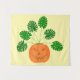 Esta tapeçaria maravilhosa mostra uma imagem de arte digital de uma série de folhas de uma usina doméstica chamada Monstera, também conhecida como a usina suíça de queijo. As folhas são verdes escuras e lobadas e algumas têm buracos. A planta está contida em dentro, uma abóbora de Halloween assustadora, com aspecto laranja, com um sorriso perverso, dentes afiados e olhos mau.