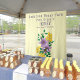 Uma abelha fofa numa flor de cor lavanda com pente de mel e fundo amarelo.