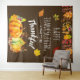 Uma tapeçaria com o texto: Feliz Dia de Ação de Graças a um momento de agradecimento (pode ser editado/ mudado para outra coisa). Projetado com uma ilustração aquosa de abóboras, boletas, cogumelos e folhas sazonais de outono. Uma fronteira ao longo do topo também composta por folhas de outono, bagas, bolotas e outras folhagem. Fundo castanho escuro. Folhas de carvalho, elm e maple caindo em torno da tipografia.