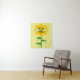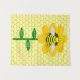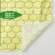 Esta incrível tapeçaria apresenta uma imagem gráfica de uma linda abelha melífera amarela com listras pretas, olhos, antenas e pernas. Ela tem lindas asas azuis e brancas. A abelha está sentada no meio de um girassol amarelo dourado. A flor tem um caule verde e três folhas. A mensagem "feliz dia da abelha" aparece espalhada pelas três folhas. O fundo é composto por um padrão de favo de mel amarelo.
