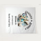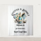 Bela concha de ostra iridescente aberta com uma garrafa de vinho espumante na frente, colocada contra um fundo branco que tem modelos de texto preto editáveis para a sua redação personalizada. Esta decoração de parede é ideal para uma festa ou evento com tema de praia, náutico, marinho, sob o mar ou frutos do mar.
