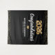 Tapeçaria elegante para festa de formatura com um fundo preto elegante que pode ser alterado para qualquer cor, o ano da turma "2025" em balões de hélio dourados, bordas com brilho dourado, o título "parabéns", o nome deles e a escola ou faculdade que frequentaram.