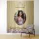 No topo deste pano de fundo impressionante está uma tiara cativante, adornada de ouro e joias ametistas. A intrincada design de tiara reflete a intrincada transição da infância para a infância, simbolizando a jornada da jovem para a maturidade e independência. Suas joias radiantes captam a luz, lançando delicadas reflexões que dançam ao fundo e adicionam uma camada extra de esplendor à cena. Como ponto focal, há uma foto enquadrada da própria quinceañera, capturando um momento congelado no tempo. A foto capta seu sorriso radiante, o brilho em seus olhos, e o entusiasmo que dela emana enquanto ela se posiciona na beira desse marco transformador. Seu vestido, provavelmente uma mistura harmoniosa de ouro e roxo, complementa as cores do pano de fundo, criando uma conexão perfeita entre ela e o cenário. No geral, o pano de fundo da Fiesta de Quinceañera é uma obra-prima visual, uma combinação artística de ouro gradiente e matizes roxas que estabeleceu o palco para uma celebração memorável. A tiara e a fotografia da quinceañera servem como lembretes pungentes do significado do evento e do espírito radiante da jovem no coração da celebração.
