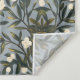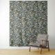 Seamless pattern wallpaper featuring dark green foliage and small white blossoms against a dusty blue-gray background.