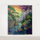 Ilustração vibrante de um rio numa floresta encantada