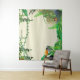 Fundo de cena com videiras penduradas, samambaias, borboletas e um tucano. A data pode ser alterada para qualquer texto ou excluída. Imagem por vecteezy.com.