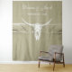 Fundo de cena rústico de caveira de boi ocidental verde-sage branco rústico para recepção de casamento cowboy. Textura desgastada impressa em estilo de fazenda vintage. Adereço de casamento antigo estilo faroeste. Design moderno e trendy de animal de fazenda. Personalize o roteiro. Direitos autorais da imagem Marg Seregelyi Photography.