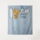 Você vai adorar este fundo aquarela azul com um varal segurando um babador, Ursinho Teddy, meias, babete e um passarinho. O texto diz É um Menino! Ótimo para tirar fotos com seus convidados no seu chá de bebê!