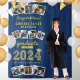 Esboço Dourado Em um Fundo Azul Escuro Tipografia Negrito, Parabéns à Turma de Formatura de 2024, Boina de Doutorado / Gorro de Formatura Dourado, Nove Colagem de Fotos Múltiplas Cortina de Fundo para Cabine de Fotos de Festa de Formatura.