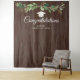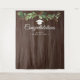 Um belo fundo para fotos para adicionar um toque especial à sua festa de formatura. Este design apresenta um arranjo de eucalipto verde em aquarela sobre uma madeira escura pintada e um chapéu de formatura branco e dourado por baixo. "Parabéns" está em fonte cursiva branca e seu nome e data/turma também estão em fonte sans serif branca.