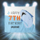 Fundo de aniversário de tubarão para crianças. Placa de aniversário de 7 anos em azul e laranja para decorações de aniversário de menino ou menina de sete anos.