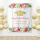Celebre seu graduado com um fundo de festa de graduação tropical chique para fotos, apresentando um chapéu de graduação em folha de ouro falso com uma moldura exuberante de folhas de palmeira verde e lindas flores de hibisco em tons de rosa quente, amarelo solar, verde e branco. O texto moderno "Parabéns" em rosa magenta e dourado pode ser personalizado com o nome do graduado e ano de formatura.