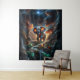 Uma cena surreal e fantástica, com um elefante de cor vibrante no meio de uma paisagem rochosa e montanhosa. O elefante é enfeitado com padrões intrincados, girando em tons brilhantes de azul, laranja e vermelho, dando a ele uma aparência de outro mundo. O fundo destaca céus dramáticos, cheios de nuvens, com um elemento cósmico, à medida que um céu noturno estrelado é visível acima.