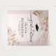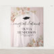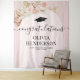 Tapeçaria de graduação boêmia elegante com fundo rosa poeira com um arco floral, folhas de palmeira secas do deserto de aquarela, grama pampas, um boné de formatura, o título "parabéns", o nome deles, escola e ano de turma.