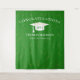 Celebração de graduação moderna com fundo verde para oportunidades de fotos! Brilho no topo e na parte inferior, serpentinas douradas da borda superior, chapéu de graduação branco e letras em branco. Turma de em letras cursivas douradas com modelo do ano em verde. Adicione o ano, nome e nome da escola.