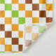 A vibrant checkered pattern of alternating green, orange, and brown squares on a white background. The design creates a lively, geometric feel.