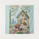 Uma jovem com flores coloridas em seu cabelo está dormindo tranquilamente em frente a uma casa branca feita de várias sobras coloridas de papel. Árvores e flores florescentes rodeiam a cena, criando uma atmosfera sonhadora. Digital Art Photoshop CS5