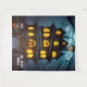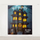 Design de "Feliz Dia das Bruxas" da casa assombrada com uma casa assombrada de estilo gótico, com janelas brilhantes amarelas com um céu noturno sombrio e nebuloso, lanternas de jack com uma cerca de ferro preto assustadora e até um fantasma ou duas voando. Design composto por Holiday Hearts Design (direitos reservados).