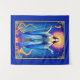 Tapeçaria no cartão de tarô "A Rainha dos Terras". De pé, na região, em vestes azuis, radiantes sob um halo ouro, ela segura uma varinha, simbolizando poder e criatividade. Cercada por galhos e estrelas ferozes, ela exalta confiança, calor e força espiritual
