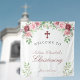 Tapeçaria de boas-vindas para batizado ou batismo de primavera ou verão, elegante e sofisticada, com uma cruz, rosas peônia pintadas à mão em rosa e vermelho burgundy, folhas e folhagens verdes, e com uma caligrafia editável e elegante de letra trendy. +++++++++++++ O letreiro é adequado para eventos religiosos de meninas ou meninos - batizado, batismo, primeira comunhão, dedicação.