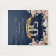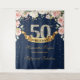 Lindo boho azul marinho e rosa bege floral 50º aniversário tapeçaria de fundo para festa, com rosas florais rosa suave em flor e arranjo de folhagem fresca em fundo azul marinho e brilhos dourados. Entre em contato para outra IDADE ou para personalização. Rosas Bege