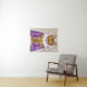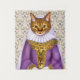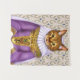 Tapeçaria num retrato de um gato gengibre, vestido como uma donzela de gato medieval aristocrática, num vestido roxo, elaborado e um véu