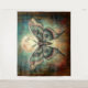 Uma mariposa grande com padrões intrincados em suas asas é exibida de forma destacada contra o pano de fundo de uma lua de cheio. As asas da traça são predominantemente lacrimejantes e cinzas com pistas de rosa, enquanto a lua é um amarelo pálido. O fundo apresenta um padrão giratório em verdes e azuis mudos, lembrando um céu noturno. A própria mariposa tem múltiplos pontos de vista em suas asas, criando uma imagem mística e cativante.