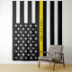 Esta tapeçaria, que pode ser usada como fundo para fotos em ocasiões especiais, apresenta uma bandeira americana da linha amarela fina de despachante em preto e branco, juntamente com o nome de um oficial para você personalizar.